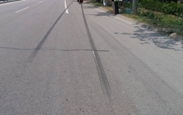 之后泥头车顶着电动车行驶了几十米,司机才发现前方有一辆电动车,马上刹车,导致地面上的剐蹭长达几十米距离。