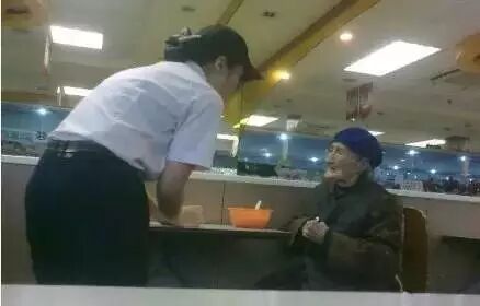 9、一个80岁的婆婆来吃饭,问服务员,我只有2块钱,我想喝汤。因为老婆婆耳朵听不清楚,说话也不清楚,当时我能清楚的感受到老婆婆那种无奈的心情,老婆婆差点哭了,随后服务员端上一碗汤饭,婆婆看见里面有蛋,急忙说,我不要肉,我只有两块钱。服务员说,婆婆这个不要钱,慢慢吃……服务员姐姐好样的!