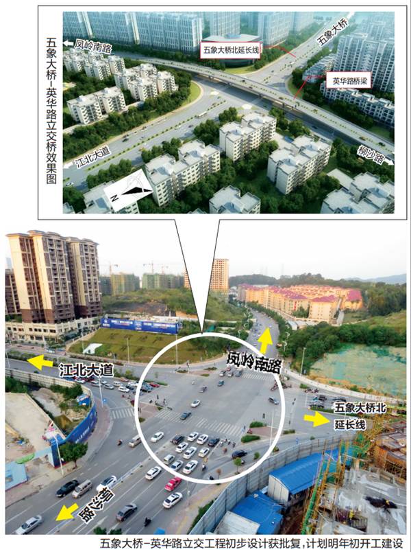 据了解,最初设计单位提出了三个设计方案。除了英华路上跨五象大桥延长线,还有五象大桥北延长线下穿英华路及三层立交方案。不过,根据交通量预测结果,并统筹考虑立交对周围用地、工程造价等因素的影响,英华路上跨五象大桥延长线保证了东西向直行过江交通,而且能避免将过多机动车引入已经饱和的江北大道和朝阳路市中心一带,且投资较少,最终拟定用该方案。