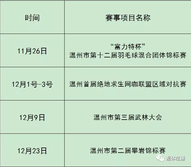相关赛事具体直播时间将在“温体在播”公众号平台发布,请密切关注。
