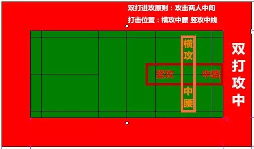 横攻中腰,推拨到对方两腰之间,对手只要稍微犹豫,不默契,精神不集中,就会导致互抢互让。很多时候下手球只要到这两个腰位,即使被对方接到,回球也会很被动,基本都是挑高球回直线。