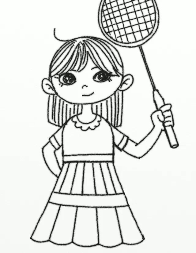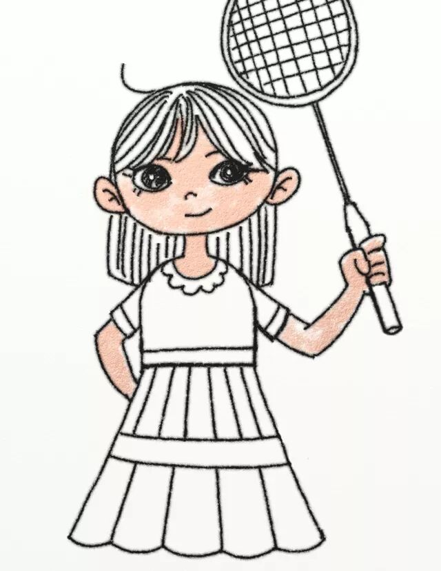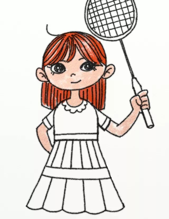 11.画出前面的手,并握着一个羽毛球拍。小女孩的形象已经明朗。