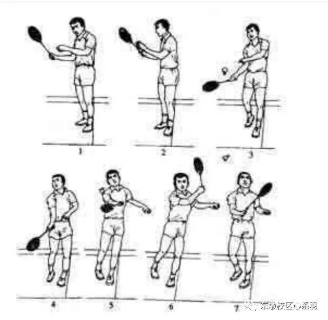 ②发高远球时,在左手放开球使之下落时,右手转拍由上臂带动前臂,自右后方沿身体向前左上方挥动。当球落 到右臂向前下方伸直能够接触到球的刹那,紧握球拍,并利用手腕屈收的力量向前上方发力击球。然后顺势向左上方挥动缓冲。