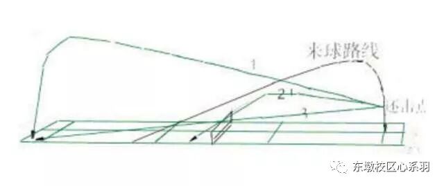 对方发高远球或平高球时,可用平高球、吊球、或杀球还击。一般来说,接发高远球是一次进攻的机会,还击的好,就掌握了主动。一些初学者常因后场技术常因后场技术没掌握好,还击球的质量较差,以致遭到对方的攻击(如图): (虚线为对方发来的高远球,“1”为还击高球;“2”为还击吊球;“3”为还击杀球)。