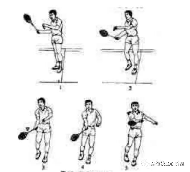 ③发平高球时,动作过程大致与发高远球相同,只是在击球的一刹那,前臂加速带动手腕向前上方挥动,拍面要向前上方倾斜,以向前用力为主。注意发出球的弧线以对方伸拍击不着球的高度为宜,并应落到对方场区底线。