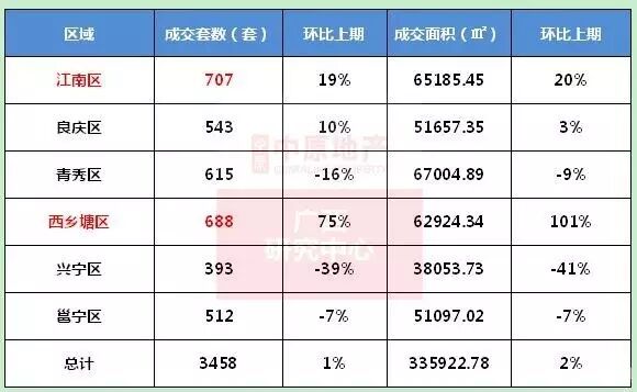 ☞从各类型商品房成交的区域分布来看,上周(2016.10.31-11.6)南宁市江南区网签707套,面积约6.5万㎡,环比增长20%;西乡塘区网签688套,面积约6.3万㎡,环比增长101%,增幅较大;青秀区网签615套,面积6.7万㎡,网签面积为六区之最;兴宁区出现较大降幅,网签面积下降41%。