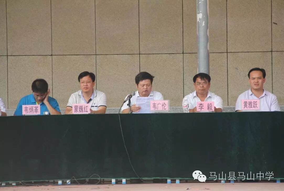 群英汇聚,戎装待发。5日下午,马山中学在田径场举行2016年新生军训成果汇报大会,验收一周来的军训成果。校长韦广伦,党支部书记李毅,副校长蒙巍红、韦炳革、黄雅跃、石克祥以及教官、部分中层领导等参加了大会,韦校长还做了会后总结发言。