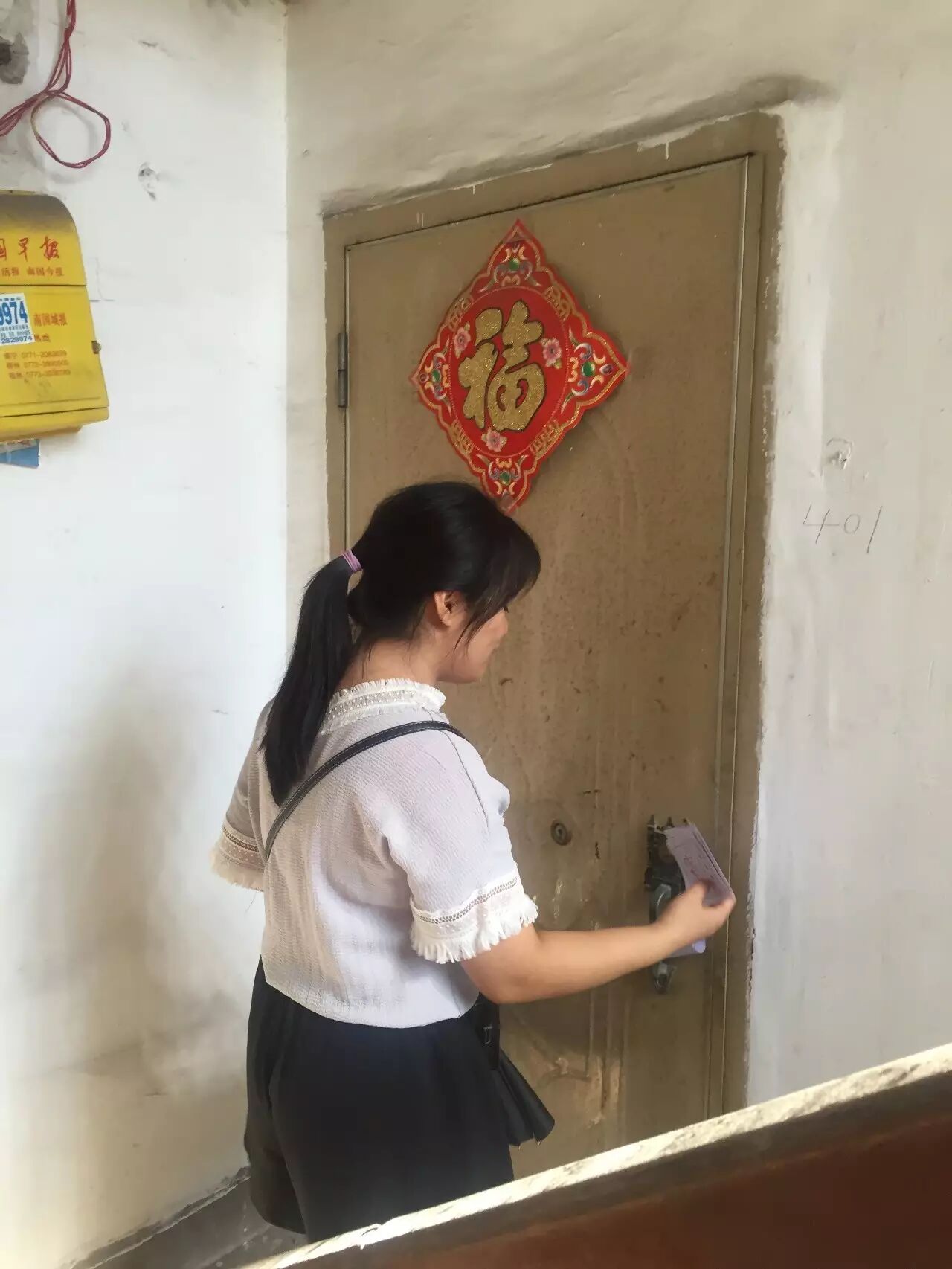 图为:社工协助社区工作人员粘贴选民公告