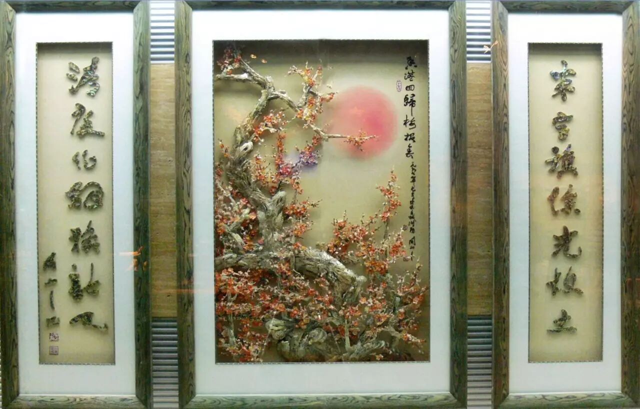广西民族博物馆收藏着一幅大型贝雕艺术画《香港回归梅报春》。它是2007年广西政府在香港回归十周年之际赠予香港特别行政区政府的珍贵贺礼的“孪生姊妹”。为了制作这两幅作品,当年工艺师们从近900公斤的贝壳与海螺中精挑细选,历时两个多月才制作而成,足见贝雕艺术标准之高!