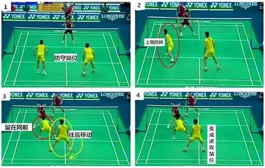 。这种球守方前场队员拦截不到,后场队员又只能以下手击球放网或挑高球,后场两角便会露出很大空档,因而有隙可乘,攻击他的空档或身体位。