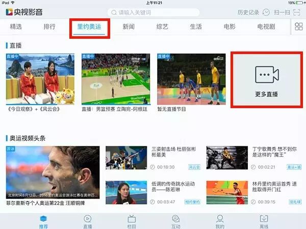 2.点击顶部的“里约奥运”-下拉屏幕-点击“更多直播”