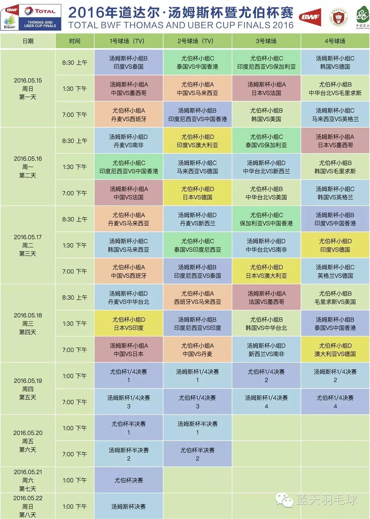 2016年汤尤杯羽毛球赛于5月15日至5月22日在江苏省昆山市举行,以下是电视直播时间表: