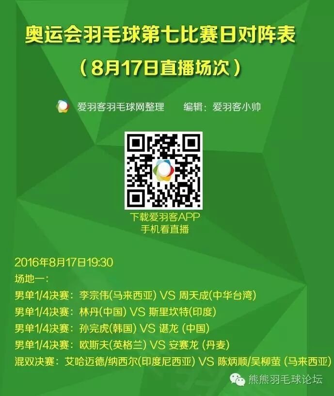 “一样的比赛,不一样的解说”,2016年8月17日晚7:30熊熊教练在爱羽客直播频道等你:)