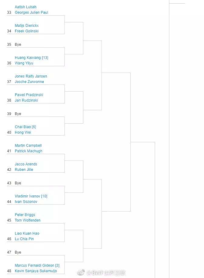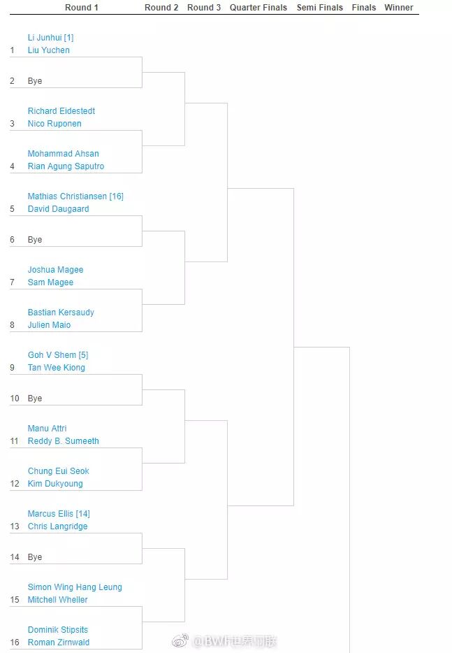 #2017年羽毛球世锦赛#男双签表:头号种子李俊慧/刘雨辰和阿山/萨普特罗、吴蔚昇与陈蔚强、嘉村健士/园田启悟、彼得森/科尔汀位列上半区。鲍伊/摩根森、吉迪恩/苏卡穆约、刘成/张楠、柴飚/洪炜、黄凯祥/王懿律位列下半区。