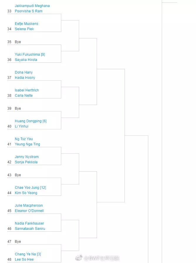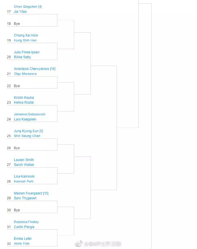#2017年羽毛球世锦赛#女双签表:日本的“松糕组合”、韩国组合郑景银/申昇瓒、中国的陈清晨/贾一凡分在上半区。韩国组合张艺娜/李绍希、丹麦组合尤尔/彼得森、中国的黄东萍/李茵晖位列下半区。