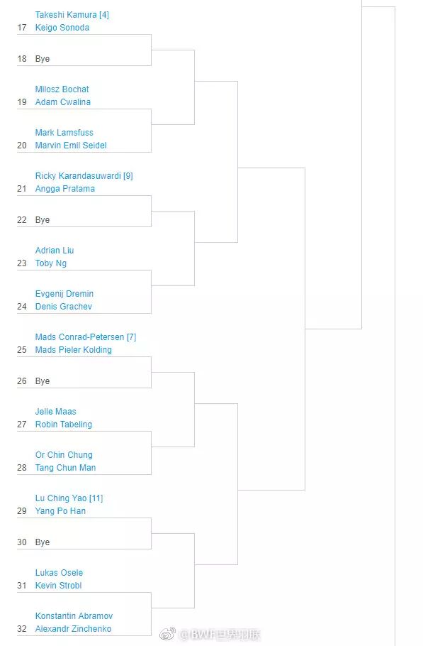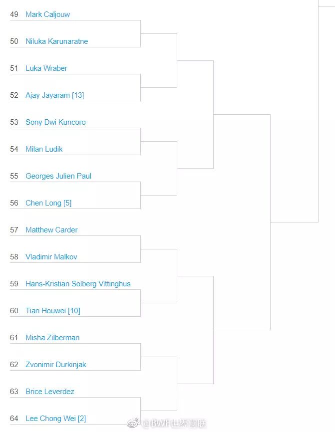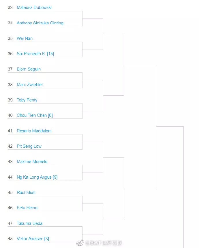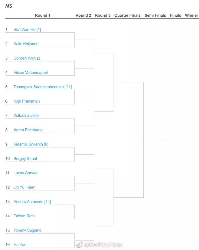 #2017年羽毛球世锦赛#男单签表:李宗伟、谌龙、安赛龙位列下半区,林丹、孙完虎、斯里坎特位列下半区。