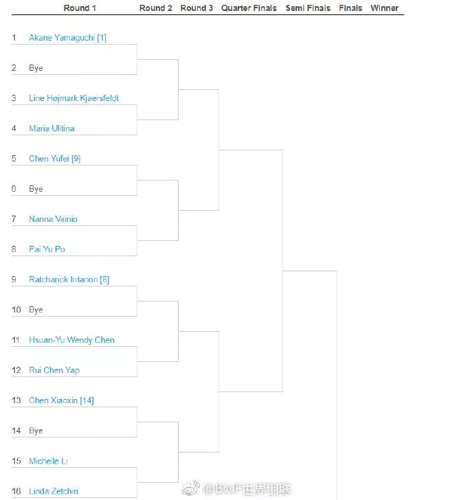 #2017年羽毛球世锦赛#女单签表:戴资颖因为世界大学生运动会而缺席,头号种子山口茜领衔上半区,同区的还有因达农、辛德胡,以及中国选手孙瑜、陈雨菲、陈晓欣。下半区有成池铉、马林、奥原希望、大堀彩、何冰娇。