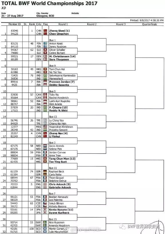 #2017年羽毛球世锦赛#混双签表:郑思维/陈清晨、张楠/李茵晖、乔丹/苏桑托、爱德考克夫妇位列上半区。黄雅琼/鲁恺、崔率圭/蔡侑玎、尼尔森/彼得森位列下半区