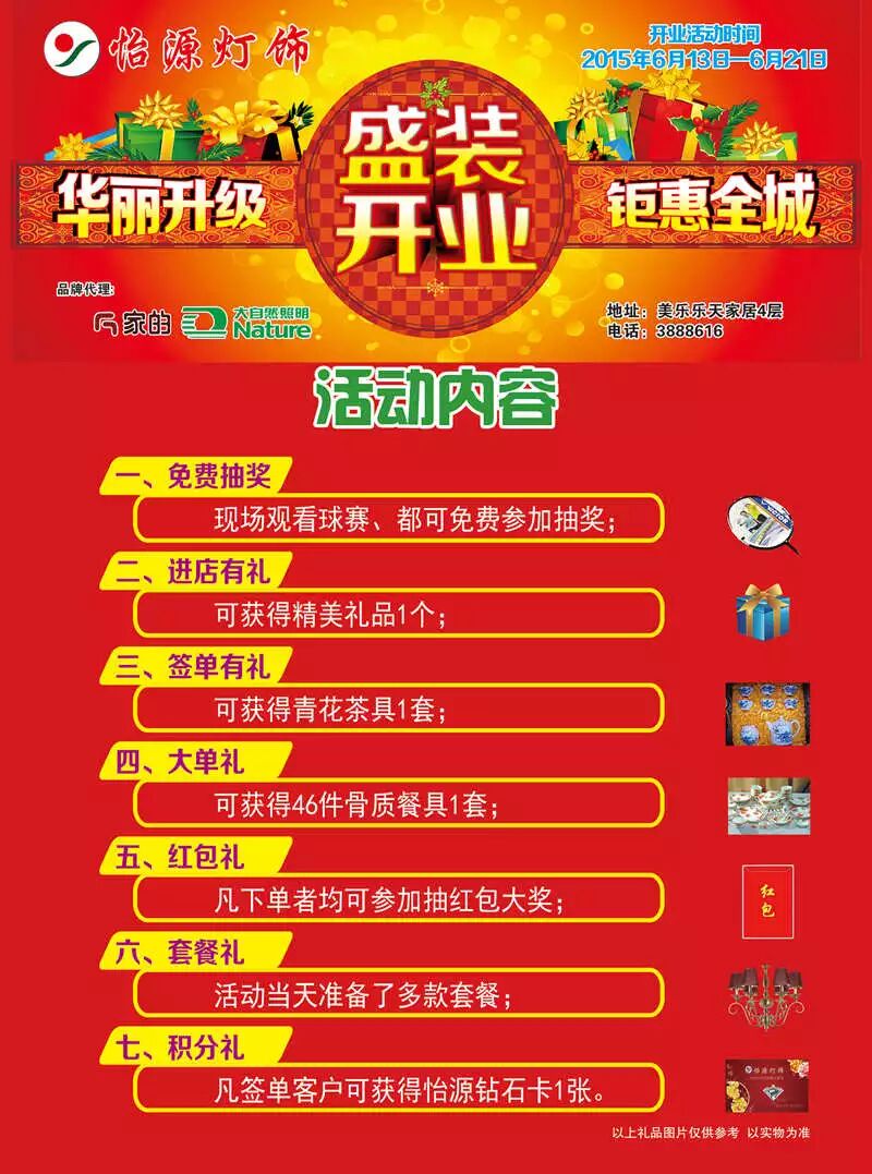6月13日,威海怡源灯饰盛装开业,华丽升级,多重豪礼钜惠全城。欢迎大家来美乐乐天家居和小伙伴们一起玩耍,打打羽毛球,领个精美礼品,选盏心爱灯具,照亮美丽爱家!
