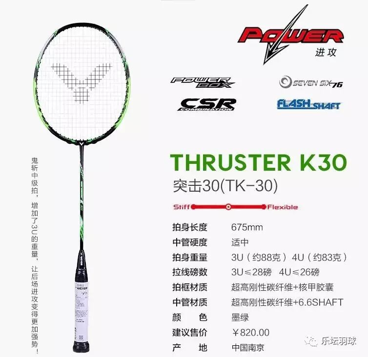 鬼斩之所以在2015年取得了非常大的成功,主要因素是它搭载了FLASH6.4(直径6.4mm)的极细中杆。这在VICTOR球拍中属于成本最高素质也最出色的中杆。其中杆反弹性能在业内中也算是领先的。而胜利小鬼斩TK30羽毛球拍这次搭配了FLASH6.6(直径6.6mm)的次极细中杆,价格虽然减少了将近一半。但是对TK30毫不吝啬的投入中杆成本,把原价在1000元以上才有的中杆,下降给TK30。不仅如此,TK30的拍框还用了成熟的CSR内发泡科技。确保拍框拥有较好的稳定性和吸震性。所以VICTOR对TK30的打造还是用心足料的。