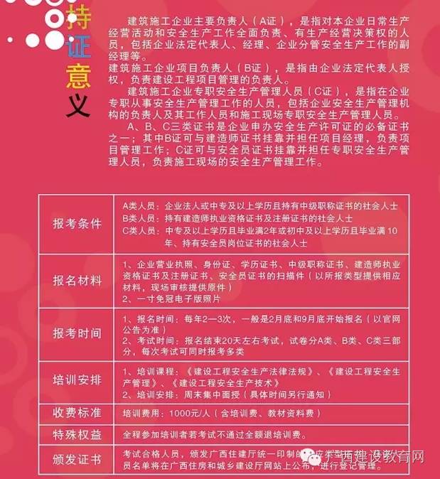 培训项目:施工员、质量员、材料员、资料员、劳务员、测量验线员、机械员、试验员、监理员、造价员、企业负责人(安全A本)、项目负责人(安全B本)、专职安全员(安全C本)等。