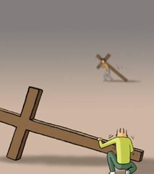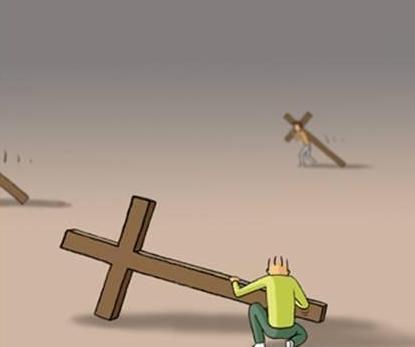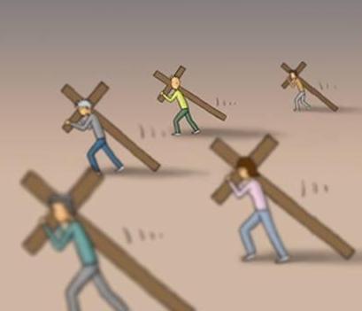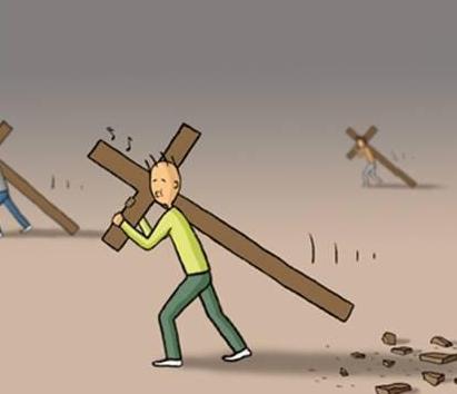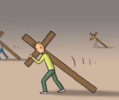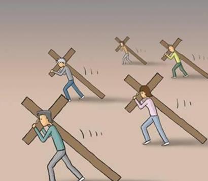 第一幅漫画中,每个人都背负着一个沉重的十字架,在缓慢而艰难地前行!