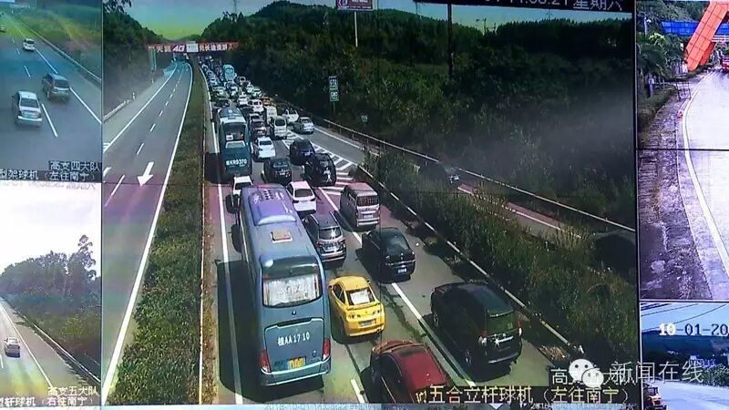 但这样顺畅的局面并没能持续多久,在五合至南宁东收费站三公路多的路程里,直到下午两点多,记者在广西公安厅交警总队指挥中心依然可以看到,这一路段持续缓慢通行的场景。而同一时间,南宁市其他出城高速公路路口已经畅通。据广西高速交警五大队民警介绍,南宁东收费站今天持续长时间的缓慢通行甚至拥堵,除了车流量大外,还跟新收费站有关。
