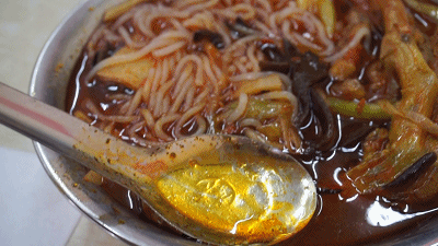 粉一端上来,那股香辣味扑鼻而来,红红的一层辣椒油满满的铺在粉和配料上,小花已经抵挡不住如此逼人的诱惑!