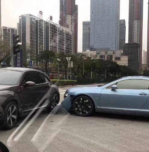 在南宁会展中心附近发生了一起交通事故,一辆价值400万元的宾利撞上20万的大众甲壳虫