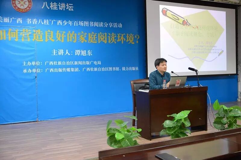 △谭旭东在广西壮族自治区图书馆做“如何营造良好的家庭阅读环境”主题讲座