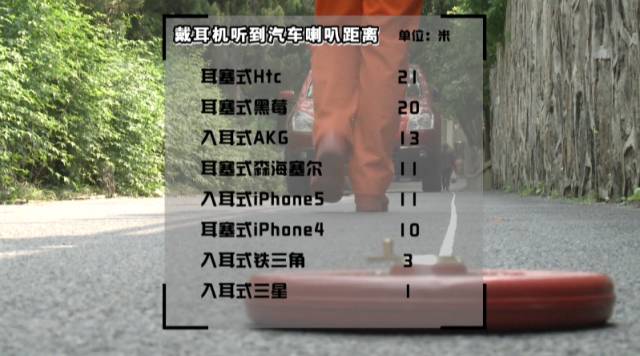 戴着iPhone耳机听音乐,距离10米远才听到汽车喇叭的鸣叫声,而这远远低于汽车刹车的有效距离。而另一款三星入耳式手机,直到离汽车1米远的地方才听见喇叭声。