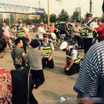 【交警与肇事者同跪在地】据燕赵都市网报道,今天在邯郸街头,一车辆驾驶人涉嫌酒驾被交警查获后,他的老母亲跪地求情,交警于是跪地耐心解释酒驾行为对驾驶人和其它交通参与人的危害。其详细情况正在进一步了解,将会及时向公众公布。