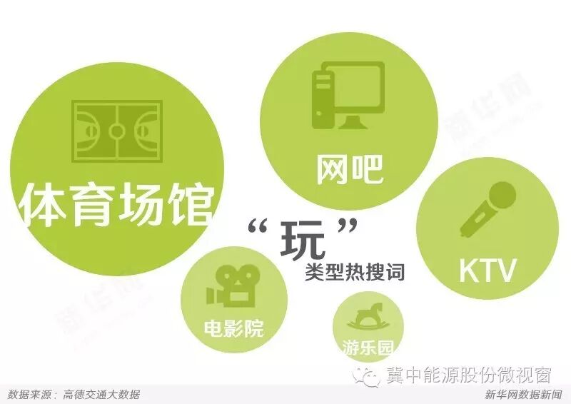 搜索“娱乐地点”的比例最多的城市,前五名分别是南宁、南昌、长春、上海和惠州,搜索“游”类型第一的是体育场馆。