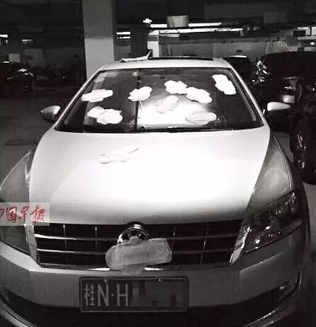 11月8日,网友“绿婚纱”在钦州当地论坛发出一张车子被人“恶搞”的图片,只见一辆白色私家车停放于车库内,车子前车窗、车头、车牌等多处被贴女士卫生巾,多达10张。