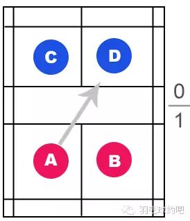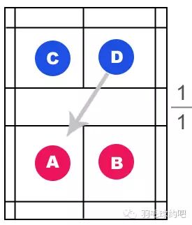 二、A和B得1分。A和B交换发球区。A从左发球区再次发球。C和D在原发球区接发球。1-0从左发球区A发球,D接发球。