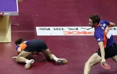 去年苏州世乒赛,张继科为了给许昕让位,居然趴到地上躲球,太机智了!