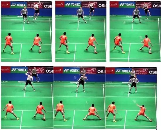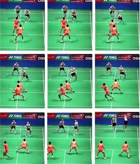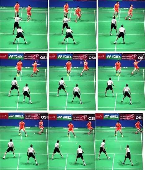 图2是发后场球的跑位路径(白色球衣为鲍伊/摩根森)。鲍伊在左区发球,发4号区。球发出后,从图2-3开始,他的身体重心逐渐向左后方撤,同时注意接发球一方(橘红球衣),左场区一方队员后撤接发时(只是移动尚未击球),右场区一方的队员迅速向中线位置移动,并在同伴击球瞬间,。再从图2-9的情况看,,基本与同伴呈平行位置,这样更有利于防守对手的杀球。