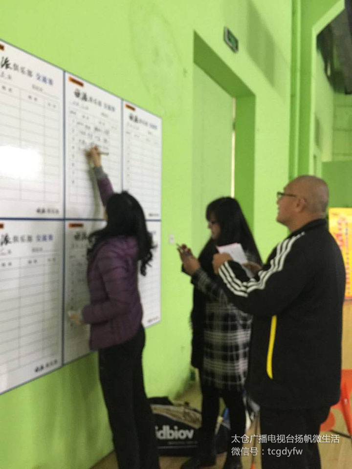经过激烈的角逐,最后A队获得羽毛球联赛团体冠军。图为辛勤计分的工作人员。