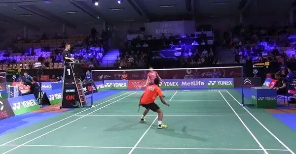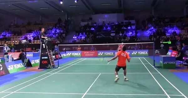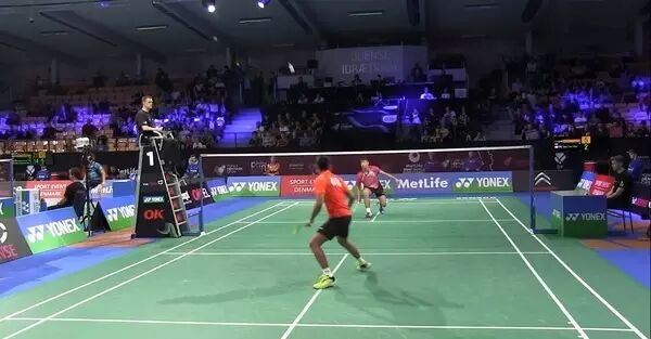 我们可以看到,林丹的身体同样是类似一个侧身。他左脚迈出一大步,右脚在后面并不跟进,而是保持在了场地中心附近的位置。他左手最大限度伸出去够这个低点球,在处于被动的情况下并没有着急抢高点,而是回放网之后回中作为过渡球。