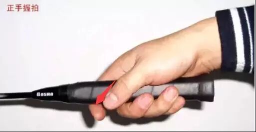 正手握拍时,拇指斜着贴在宽面上,反手握拍时,拇指可以与宽面平行贴在宽面上。同时注意食指位置的区别。